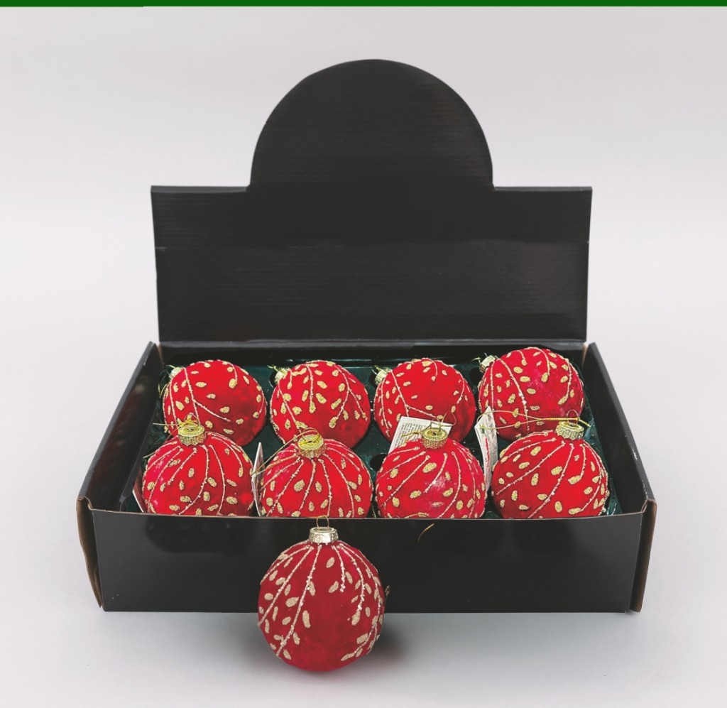 8 SFERE VETRO MM.70 ROSSO SATINATE/METALLIZZATE ASS.IN CILINDRO