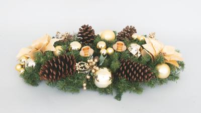 CENTROTAVOLA PVC C/VASO VETRO CM.50X20H DEC.ORO FIORI SFERE E PIGNE
